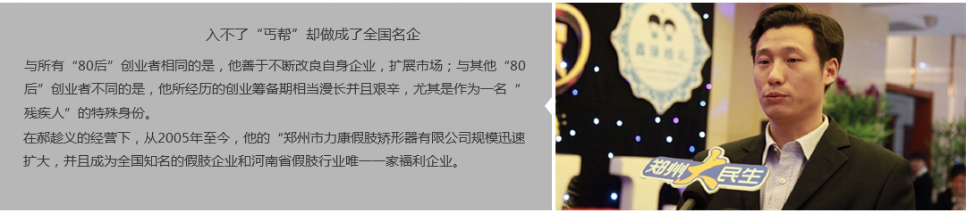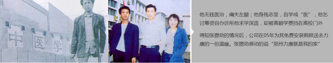 鄭州市力康假肢矯形器有限公司(簡稱力康),是一家專業(yè)從事假肢矯形器的設(shè)計、研發(fā)、制作及裝 配的專業(yè)機構(gòu)。成立于1992年是河南省唯一一家福利企業(yè)。力康下設(shè)業(yè)務(wù)部、技術(shù)部、住院部、康復(fù) 部、售后服務(wù)部,并配有現(xiàn)代化的裝配車間和功能齊全的訓(xùn)練大廳,為殘疾朋友康復(fù)訓(xùn)練提供了可靠 保障。總經(jīng)理穿戴假肢多年,有著豐富的臨床經(jīng)驗和親身體會;多年來,力康已為全國幾十萬名殘疾 朋友安裝上舒適、美觀、耐用的假肢和矯形器具,使他們更大限度地恢復(fù)了正常的工作和生活。“產(chǎn) 品即人品”的質(zhì)量理念、先進的技術(shù)、實惠的價格、完善的售后服務(wù)是力康取勝的法寶……